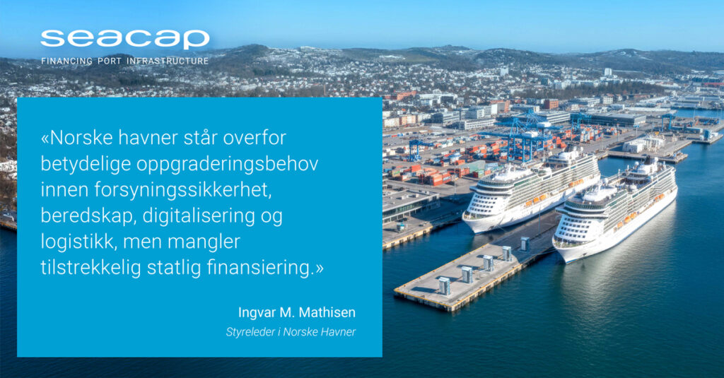 – Norske havner står overfor betydelige oppgraderingsbehov innen forsyningssikkerhet, beredskap, digitalisering og logistikk – dessverre uten tilstrekkelig statlig finansiering, sier Ingvar M. Mathisen, styreleder i interesse- og medlemsorganisasjonen Norske Havner.
